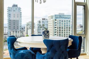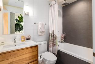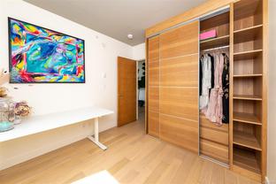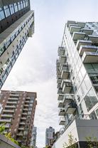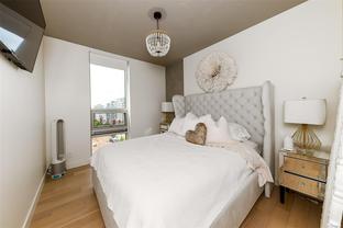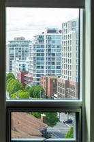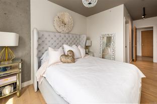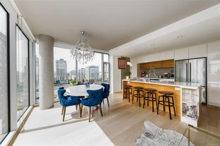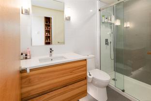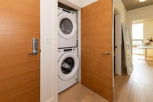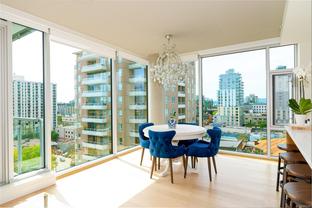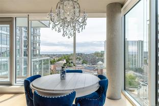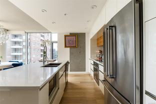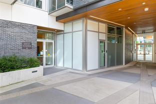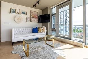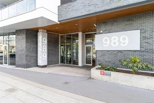 This bright and exquisite condo situated on a southwest facing corner, has views of the Olympic mountains, the Strait of Juan de Fuca and the city. Located at 989 Johnson, a newer modern steel and concrete building features natural light and floor to ceiling windows. This home has quartz countertops, Kitchen Aid appliances, induction cooktop, engineered hard-wood and designer kitchen and bathroom fixtures. The blend of warm wood and concrete accents makes this unit feel like home, perfect for entertaining with the large island. The primary bedroom is spacious and well designed with custom built-ins leading to the ensuite. Located in the vibrant Harris Green neighborhood it is steps from restaurants, coffee shops, gyms, grocery stores and transit. One secure underground parking spot and storage locker included. Central downtown location with Rentals allowed and a pet friendly complex, call today for a viewing!