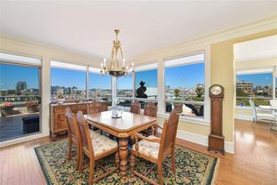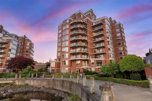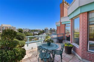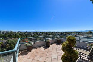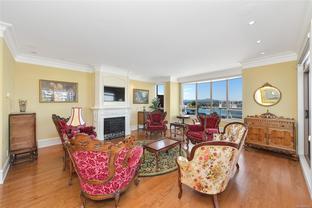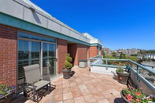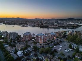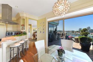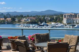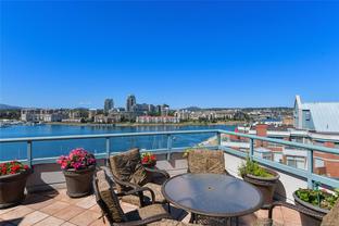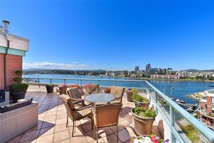 Sweeping, jaw dropping views of Victoria’s acclaimed Inner Harbour. Extremely rare WATERFRONT PENTHOUSE CONDO. This top floor residence offers just over 2600 Sq.Ft. of interior living space ( 2 Beds + Den ) coupled with 4 Deck choices with more than 1100 Sq.ft. providing 360 degree views. Your choice of two front entry ways to brilliant open spaces in your main living/dining/kitchen with heaps of natural daylight. High-end appliances from Wolf, Sub-Zero & Miele compliment the well positioned kitchen with a charming eating nook. Oak H/Wood throughout + stunning tile. 9 Ft. Ceilings. Bedrooms & den are situated on the east wing of the suite providing excellent separation from the living spaces. Relax in your spacious primary suite with its stunning 14’ vaulted ceiling & power blinds. Summertime happy hours will be the envy of the neighbourhood with all your outdoor space. Steel & Concrete Building. 2 side x side parking stalls. Seaside walk paths below + quick access to all amenities in the James Bay and Inner Harbour area. This is a unique and one of a kind condo. Live above it all here at The Harbourside Penthouse Collection. Ask your realtor to secure a private viewing.