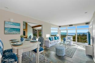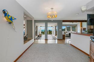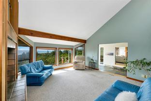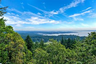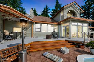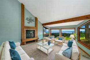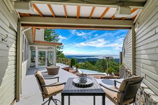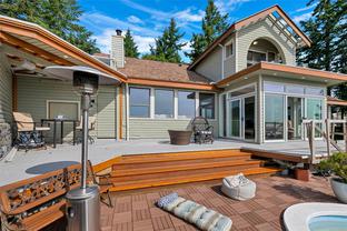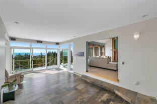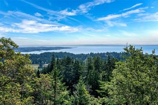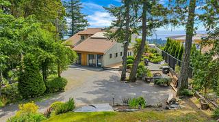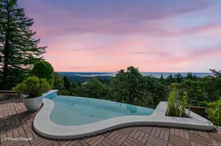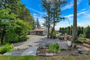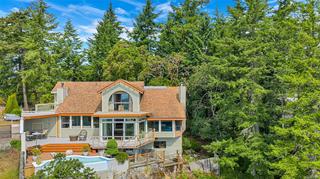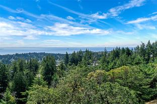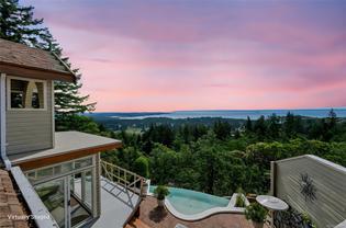 Perched at the peak of prestigious Triangle Mountain, where sky and sea converge, this one-of-a-kind West Coast home situated on .94 acre-offers an unrivaled vantage point with panoramic views stretching from the Olympic Mountains, across the Salish Sea, to the twinkling skyline of downtown Victoria. Thoughtfully designed to maximize natural light and the ever-changing coastal backdrop, the main level showcases a striking dining area framed by floor-to-ceiling windows and set on elegant slated tile. The upper gallery landing overlooks the bright, spacious living areas below, with a skylight feature flooding the home in warm light. Wood-burning fireplaces throughout provide cozy character, while tiled flooring offers both function and West Coast flair. Upstairs, several bedrooms are thoughtfully arranged, with the primary suite offering a private sanctuary complete with walk-in closet, ensuite bath, enclosed sunroom, and an intimate deck with front-row seats to Victoria’s night lights. A convenient top-floor laundry area enhances functionality. Outside, serenity unfolds in layered garden terraces, hidden nooks, and a peaceful water feature beside a mature palm tree. The private plunge pool is an unexpected luxury—perfect for soaking in the sun and the scene. Sundecks and patios flow naturally, creating an ideal blend of outdoor living and inspiration. Yes, some deferred maintenance and updates are needed—but the bones, design, and location are truly extraordinary. This is a rare opportunity for the discerning buyer to restore and personalize a masterpiece in an elite location. Properties with these views and this potential do not come along often. Let your vision breathe new life into something truly special.