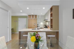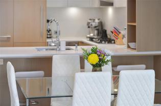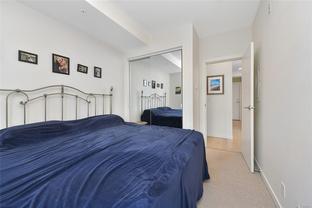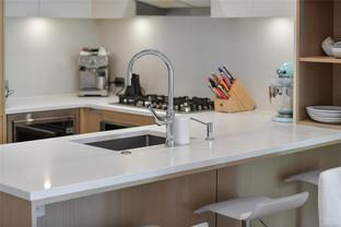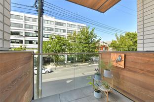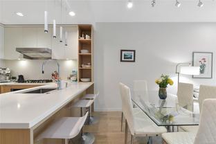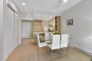 Modern and refined one bed + den residence in the award-winning Black & White by Abstract Developments. A generous foyer leads to a versatile den, ideal for remote work or added flexibility. The open layout connects dining and living spaces with custom built-ins and opens to a quiet north-facing balcony. Oak floors throughout, with soft wool carpet in the spacious bedroom. The streamlined kitchen features upgraded stainless appliances, quartz counters, gas cooktop, and integrated fridge within custom cabinetry. The spa-inspired bath includes a soaker tub, polished porcelain tile, and ambient under-cabinet lighting. Amenities include a communal outdoor lounge with kitchen and firepit, EV charging, car share, bike room, pet-friendly policy, dog wash station and secure storage. Walkable to downtown, Cook Street Village, shops, yoga, gyms, dining, and the best of Victoria.