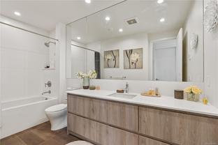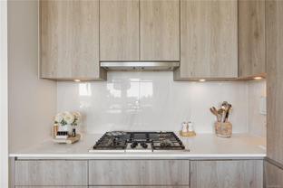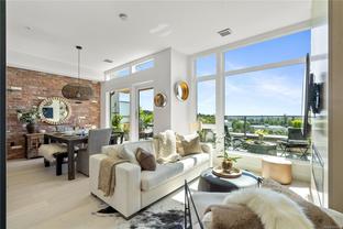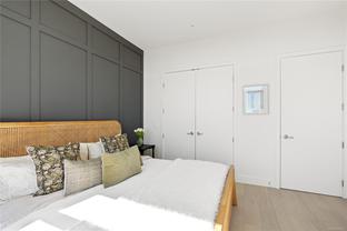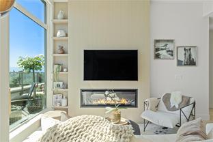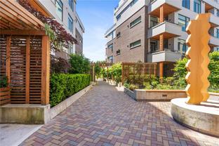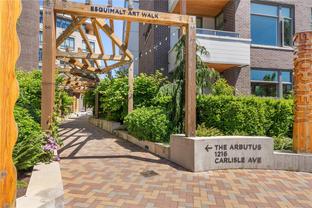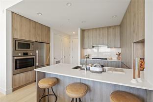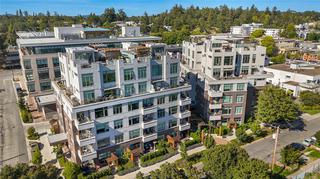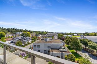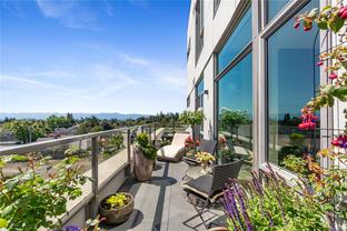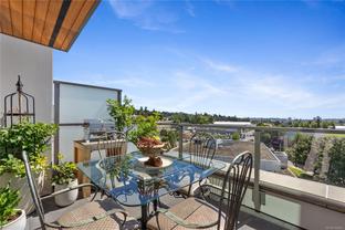 Sub Penthouse in Esquimalt Town Square! A charming and vibrant community offering the perfect blend of modern living and walkable amenities. This 1 bedroom plus den, luxury condo, offers oversized picture windows with mountain, city and ocean views from the 217 sq ft balcony! 9'7" ceilings, reclaimed brick feature wall, and modern electric fireplace. Oak flooring and Oak shelving in living room, closets and den/office. Bosch oven, gas range (gas included in strata fee), Fisher Paykel fridge, and custom cabinetry. Spacious bath with soaker tub and geothermal heated flooring. Gas BBQ hookup. Secure underground parking spot with EV charger. Live right beside the public library, ERC coffee, Saxe Point Pub, Esquimalt Rec Center with lap lanes, sauna, hot tub & steam room, 2 grocery stores within 5 minutes & Saxe Point just a walk away. Exceptionally maintained building! Low strata fees. Call your Realtor now to book your viewing!