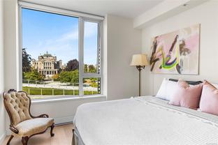 Welcome to this beautiful 2bedroom, 2bathroom condo in one of Victoria’s most loved neighbourhoods, James Bay. Located on the third floor of a high-quality steel and concrete building by Concert and Jawl Properties, this home offers a rare mix of comfort, design, and location.Enjoy natural daylight all day long in the living room,and both of the bedrooms. From the windows, take in a stunning view of the BC Legislature.The kitchen features Bosch appliances, quartz slab countertops, a waterfall island and backsplash, and custom cabinetry, a perfect blend of style and function. The contemporary layout makes the space feel open and welcoming.This unit has an easy access to Red Barn Market and the Victoria Public Library, making daily errands easy,rain or shine.This home is just steps from the Inner Harbour, Beacon Hill Park, and all that downtown Victoria has to offer. If you're looking for a bright, well-built home in a quiet, walkable location, this one is truly worth seeing.