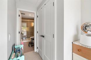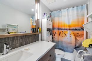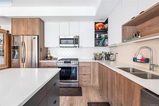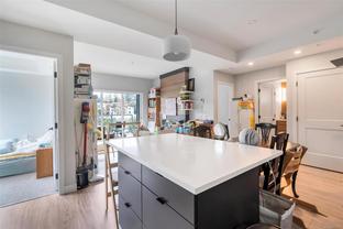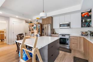 Bright and welcoming, this corner unit on the 3rd floor is a pristine two-bed, two-bath condo that feels new. The modern kitchen features premium stainless steel appliances, including a gas range, quartz countertops, and a large island with seating space. The living room includes a VRF heating and cooling system. Both bedrooms are spacious and ideal for families or those working from home. Enjoy your evenings on the spacious balcony, with secure access to one parking space and a storage locker. Located within walking distance to all amenities such as shopping, dining, and Costco, this pet-friendly unit provides access to a private gym.