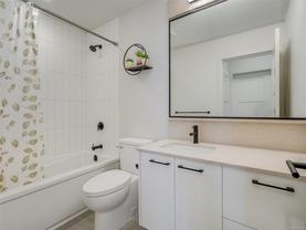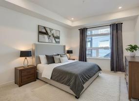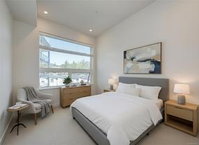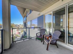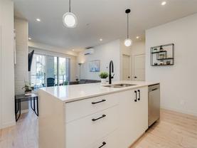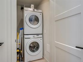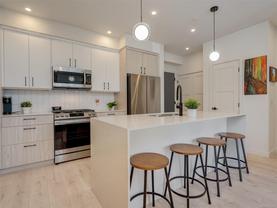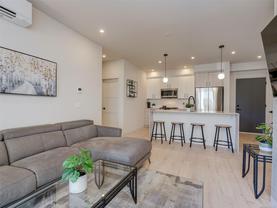Like new unit on the QUIET side of the building with TWO parking spaces. No need to compromise here! 2 bedroom, 2 bathroom, 2 parking spots on the NW side of the building with large covered balcony. Enjoy ductless split heat pumps/AC in the bedrooms and living area, quartz counters throughout with waterfall kitchen island, Samsung stainless appliance package: gas stove (convection, air fryer, dehydrator) french door fridge (ice and water) bottom mount freezer, microwave, dishwasher and stacking front load washer and dryer. Euro laminate floor in living area, ceramic tile floors and surrounds in ensuite and second bathroom. Designer cabinets throughout and large pantry! Premium tiled kitchen backsplash, shower/tub surrounds bathroom floors, and linear fireplace feature wall. One storage locker and common bike storage. Rentals, pets, BBQ’s allowed! The complex features a meeting/party room and a fitness room. Fabulous location, walk to many amenities, short drive to recreation and schools.