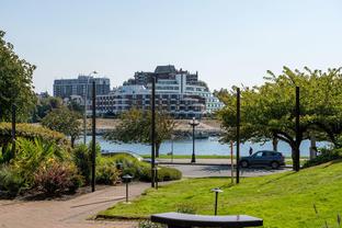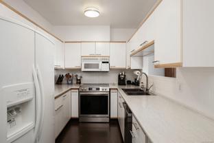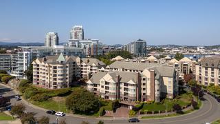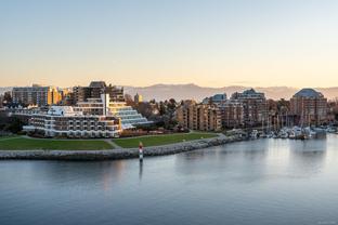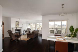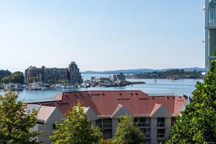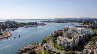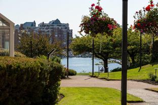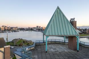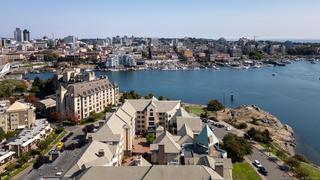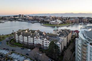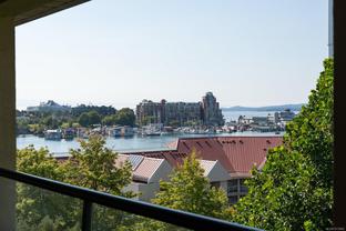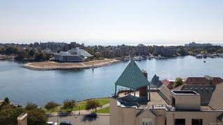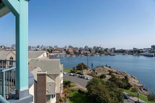 Morning sunrises over the city w/south eastern views of the Empress Hotel & Inner Harbour, along w/just under 1,500sqft of living space, makes this a standout top floor condo. Ideally located in one of the city’s most desirable neighbourhoods, offering tranquility w/immediate access to downtown. Inside, an open-concept layout features high ceilings, expansive windows & abundant natural light. The living room, anchored by a cozy gas fireplace, is framed by harbour views, while the adjacent dining area easily accommodates gatherings against the Empress Hotel & Inner Harbour backdrop. The private primary suite boasts generous proportions, large windows & spacious ensuite. A second bedroom enjoys harbour views to the south west, w/a full bath nearby. Additional highlights include a laundry room, ample in-suite storage, secure parking & building amenities such as a lounge, conference room, guest suite & landscaped courtyards, plus the waterfront pathway linking to the marina, shops & cafés.