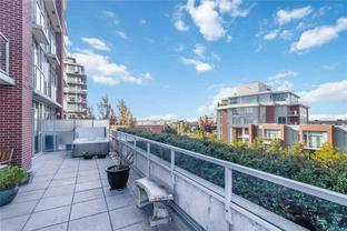 Discover one of the most exclusive homes at The Promontory, nestled within Bayview Place. This contemporary steel and concrete high-rise is situated in the vibrant heart of the Victoria West waterfront. This property has a unique and EXCLUSIVE 1,200 sq. ft. private terrace offering panoramic views of the inner and outer harbour, along with the Olympic Mountains — an ideal setting for hosting summer gatherings. Complete with a hot tub, outdoor fire pit, natural gas BBQ hook up and irrigation this stunning outdoor retreat overlooks lush greenery and southwest-facing vistas. Inside, you'll find a spacious primary bedroom with a sleek, modern ensuite, a second well-appointed bedroom and bathroom, and a bright, open-concept living and dining area highlighted by floor-to-ceiling windows. Premium finishes are featured throughout the home. This unbeatable location is just minutes from downtown by foot, bike, or bus, & close to parks, shops, the shoreline and new Victoria international Marina.