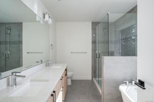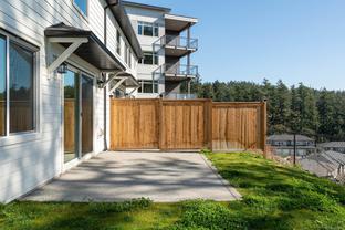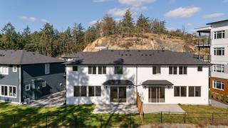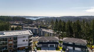 Welcome to the premier townhome at West Park at Thetis Lake, offering sweeping ocean and city views from nearly every room. This exclusive residence showcases thoughtful upgrades, including oversized living room windows, custom built-in cabinetry, and a luxurious vessel tub in the ocean-view ensuite. Built by the award-winning Limona Group, the home features a timeless layout with quality finishes throughout. The open-concept main floor highlights a spacious kitchen with quartz counters, stainless appliances, and a cozy gas fireplace, all framed by expansive ocean-view windows. Step onto your south-facing patio to soak in more stunning vistas. Upstairs, the primary suite impresses with a walk-in closet, heated floor ensuite with double sinks, and a vessel soaker tub. Additional features include a heat pump, irrigated front and rear yards, EV-ready double garage, and a 10-year new home warranty. Just steps to Thetis Lake Park. Two pets welcome. Move-in ready. Price + GST.