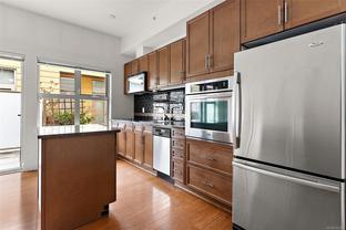 Welcome to Essencia Verde, where pet-friendly living meets the vibrant heart of Cook St. Village! This bright 1 bed, 1 bath condo offers soaring ceilings, oversized windows, engineered bamboo floors, and a spa-inspired tiled bath. The stylish kitchen boasts full-size stainless steel appliances, granite counters, and an island with storage—perfect for home chefs. Curl up by the electric fireplace or step out to your private 100+ sq ft patio, an ideal retreat for you and your four-legged friends. Built in 2010, the building features secure underground parking, bike storage, and a storage locker. Pets and rentals are welcome, making it a flexible and inviting place to call home. Steps to cafés, shops, and restaurants, and just a stroll to Dallas Rd waterfront, Beacon Hill Park, and off-leash green spaces. The perfect village lifestyle—for you and your pets!