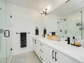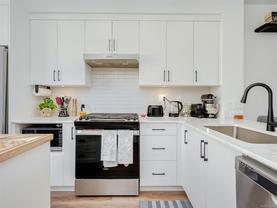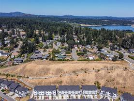 Welcome to this bright and modern home in the vibrant seaside community of Royal Bay. Designed for contemporary living, it features an open-concept layout with 9-foot ceilings and is flooded with natural light. Enjoy a private outdoor patio that backs onto green space with scenic walking trails. The sleek kitchen is complete with an island, breakfast bar, quartz countertops, gas stove, & stainless steel appliances. Upstairs, the spacious primary suite includes a luxurious ensuite with heated floors, a frameless glass shower, and engineered stone countertops. A second bedroom also offers its own private ensuite, ideal for guests or family. Additional highlights include a large garage w office/workshop space, plenty of storage, high-efficiency gas furnace, & hot water on demand. This family-friendly community offers beautiful trails, parks, & easy access to the nearby village. Embrace coastal living with no GST & the peace of mind of the remaining 2-5-10 Warranty.