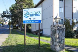 Welcome to 105-73 Gorge Road West at Cedar Shores. This 2 bed, 2 bath ground-level condo offers quiet living, tucked away from road noise and steps to the Gorge Waterway. Updated and well maintained, it features a wood-burning fireplace, spacious dining area, large kitchen with stainless steel appliances, in-suite laundry, and a primary bedroom with walk-in closet. Enjoy resort-style amenities including an indoor pool, hot tub, sauna, tennis and racquetball courts. Cedar Shores is a well-run, professionally managed building on the main bus route, offering an easy commute to Victoria. Rentals allowed! Excellent location near Downtown, Uptown, Gorge Vale Golf Club, and close access to both highways. Stroll the peaceful waterfront walkway or simply relax at home in this quiet, sought-after community with easy access and plenty of lifestyle perks. Easy to show.
