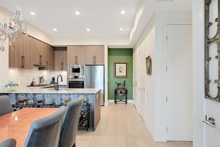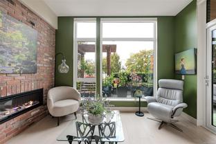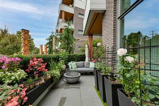 This spacious walk up luxury condo lives more like a single level townhome. Ideally located at Esquimalt Town Square, a masterplanned community built by Aragon; the quality in craftsmanship, design and materials are evident throughout the home, building and community. This 2 bed, 2 bath south facing garden home has every amenity at your doorstep. Over height 9'9'' ceilings and expansive picture windows flood this elegant corner home with natural light. A tranquil, tucked away patio provides privacy, easy indoor / outdoor living and walk-out access - a beautiful spot to host and a pet owners dream. The large living / dining area boasts a reclaimed brick feature wall with a fireplace and enough space to host a full sized dining table. Other features include engineered oak flooring, luxury appliances, heated bathroom flooring, custom window coverings, storage locker & secure underground parking with dedicated EV charger - this is a must-see. It’s more than a condo - it’s a lifestyle.