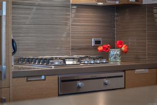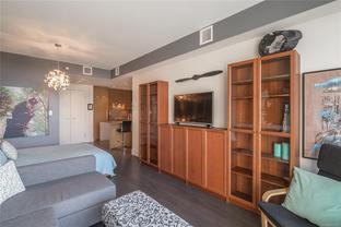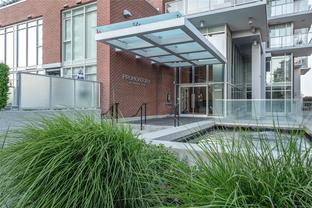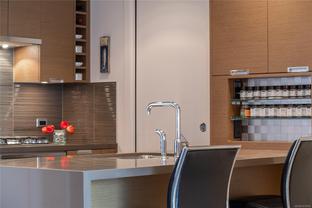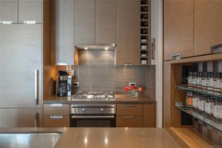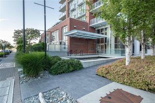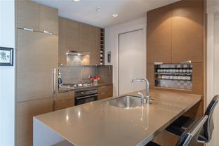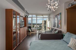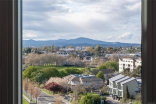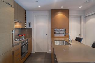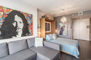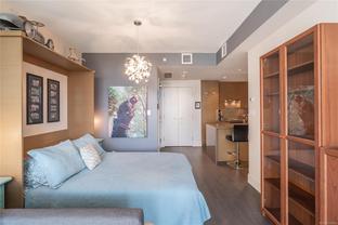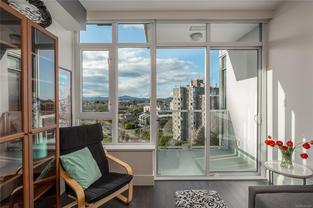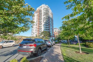 Welcome to Promontory, by Bosa Properties - 9th floor STUDIO w/ TERRIFIC VIEWS to Sooke Hills and over the trees of Vic West. Ocean views from balcony. Floor to ceiling windows that bring in plenty of light /sun from the West. Premium Concrete & Steel building, with gorgeous kitchen, comes complete with a high-end appliance package including an integrated Miele refrigerator and built-in gas range / stove & quartz countertops. Spa inspired bathroom & in suite laundry. High end amenities: Concierge, fully equipped gym, owners lounge w/kitchen, FP, large flat screen tv & outdoor patio. Strata fee includes A/C, Heat, HW, Gas, secure underground parking space/visitor parking, separate storage, bike room. No weight/size restriction for pets & dog park very close by! SUPERB location, 5 minutes to Seawall, 10 minute walk to Downtown, short stroll to shopping & amenities at Westside Village, and the ability to jog or bike along the Galloping Goose Trail/Songhees walkway. View ASAP.