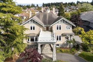 Welcome to one of Gordon Head’s most iconic estates. Originally built in 1922 for Geoff & Maud Vantreight, this distinguished heritage home rests on nearly half an acre atop one of the neighbourhood’s highest points. Surrounded by mature landscaping and featuring both front and rear access, the property has been meticulously restored to preserve its timeless charm while introducing thoughtful interior and mechanical upgrades throughout. Inside, you’ll find 7 spacious bedrooms, 5 bathrooms, across three expansive levels, totaling over 5,000 sq. ft. The main floor is an entertainer’s dream with a bright, formal living room, a large dining room, and two kitchens, one ideal for everyday use and another for hosting. French doors lead to a stunning wrap-around south-facing veranda and patio, perfect for seamless indoor-outdoor living. Upstairs, the primary retreat stretches over 40 feet with a private sitting area, Ocean Views, walk-in closet, and a 5-piece ensuite featuring the original clawfoot tub. Three additional bedrooms, two full bathrooms, and a charming sleeping porch complete this level. The lower floor adds flexibility with two large flex rooms, abundant storage, and a self-contained 1-bedroom suite, ideal for extended family or rental income. Notable architectural features include the rooftop cupola, original granite fireplaces, classic millwork, and a porte-cochere entry. This is a rare opportunity to own a piece of Saanich history with space, style, and substance in one of Victoria’s most desirable neighbourhoods.