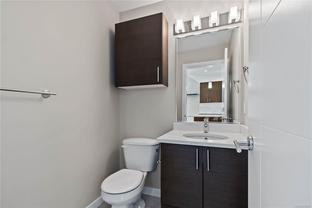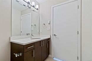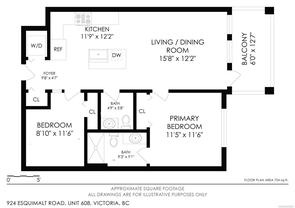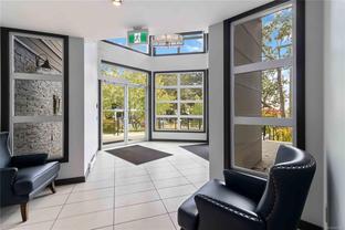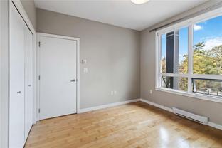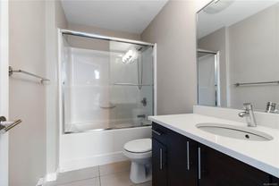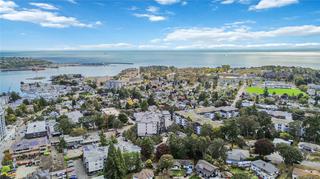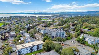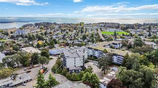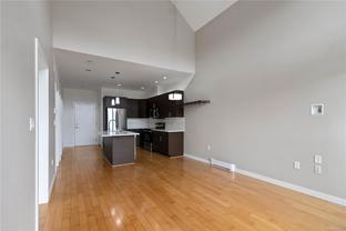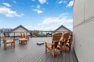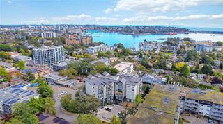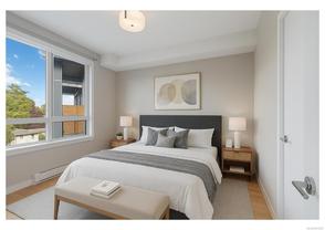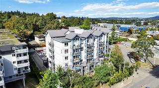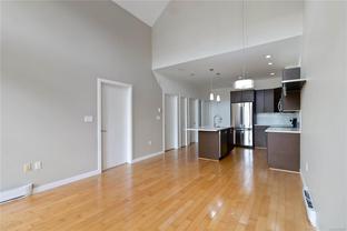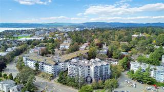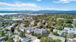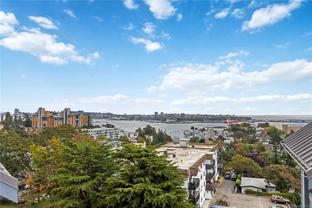Soaring above buildings and treetops is this beautiful 2 bedroom, top floor unit in Skyline Residences. This condo is uniquely designed and offers a wonderful open-concept floor plan with modern kitchen, quartz countertops, stainless steel appliances and kitchen island which blends modern living with functionality. Natural light pours through the floor to ceilings windows in the living room featuring 16ft vaulted ceilings. Large primary bedroom with an abundance of light with ensuite, second bedroom with second bathroom and laundry round out this well designed condo. Located on the quiet side of the building and including secured underground parking spot as well as a storage locker. Bonus - roof top patio with inner harbour views for your enjoyment with a location that is perfectly located just minutes to downtown Victoria, shops, restaurants, parks, military base, école Victor-Brodeur and buses. Rentals permitted and pets allowed! Vacant with quick possession!