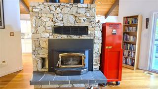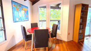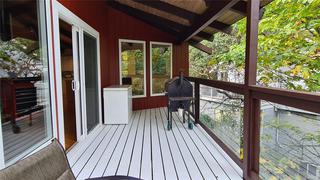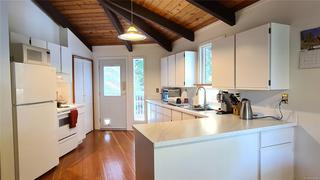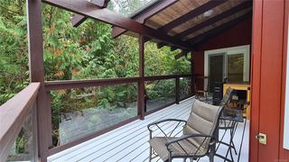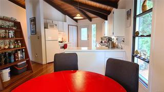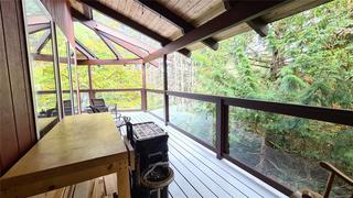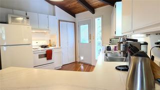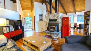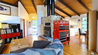 Affordable 2 Bed RANCHER, perfect for downsizing or First Time Buyers. This lovely open-plan home with vaulted ceilings, post and beam construction awaits you. Nestled amongst the trees, this two-bedroom, one-bath home provides single-level living on a large and bright lot. Centrally located, and close to all amenities and highway access. The first growth fir flooring is simply beautiful, radiating warmth and richness throughout the entire home. Enjoy evenings inside this cozy and inviting home, or outside on the roof-covered deck. The heat pump with Hepa filter and central stone fireplace provides great energy choices. Freshly painted inside and out in 2025, plus new countertops and new front deck railing. Leaf-Guard Gutter system for easy maintenance, plus a new roof in 2013 by previous owners. This resort feel, Chalet style home is a must-see at this price. Quick possession possible.
